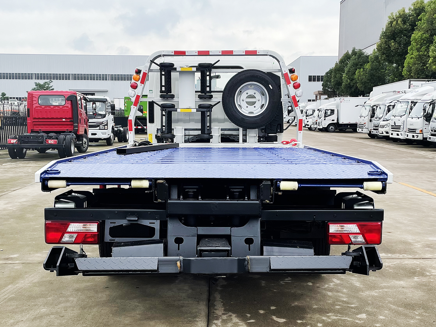 藍牌上裝配置:沖壓式伸縮板,液壓翻轉(zhuǎn)常規(guī)托舉裝置,平板可承載4噸以內(nèi)重物,主板長4~4.2米,折疊、伸縮或翻轉(zhuǎn)部分1~1.35米,平板總長可達5.1~5.35米,雙側(cè)聯(lián)動操作裝置,后工作燈三只,1個40KN液壓絞盤(25米鋼絲繩)一個工具箱一個洗手箱,配兩個**小車,四根新式綁帶,鏈鉤1條,L型抱胎架一對,托叉和托叉座各一對,帶2噸后托臂。