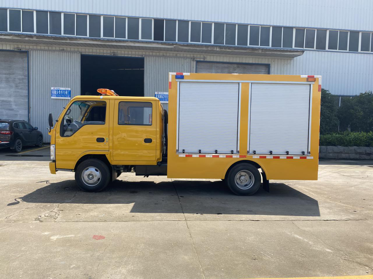 長(zhǎng)排jing燈:駕駛室頂部安裝長(zhǎng)排黃色工程jing燈,帶喊話器。